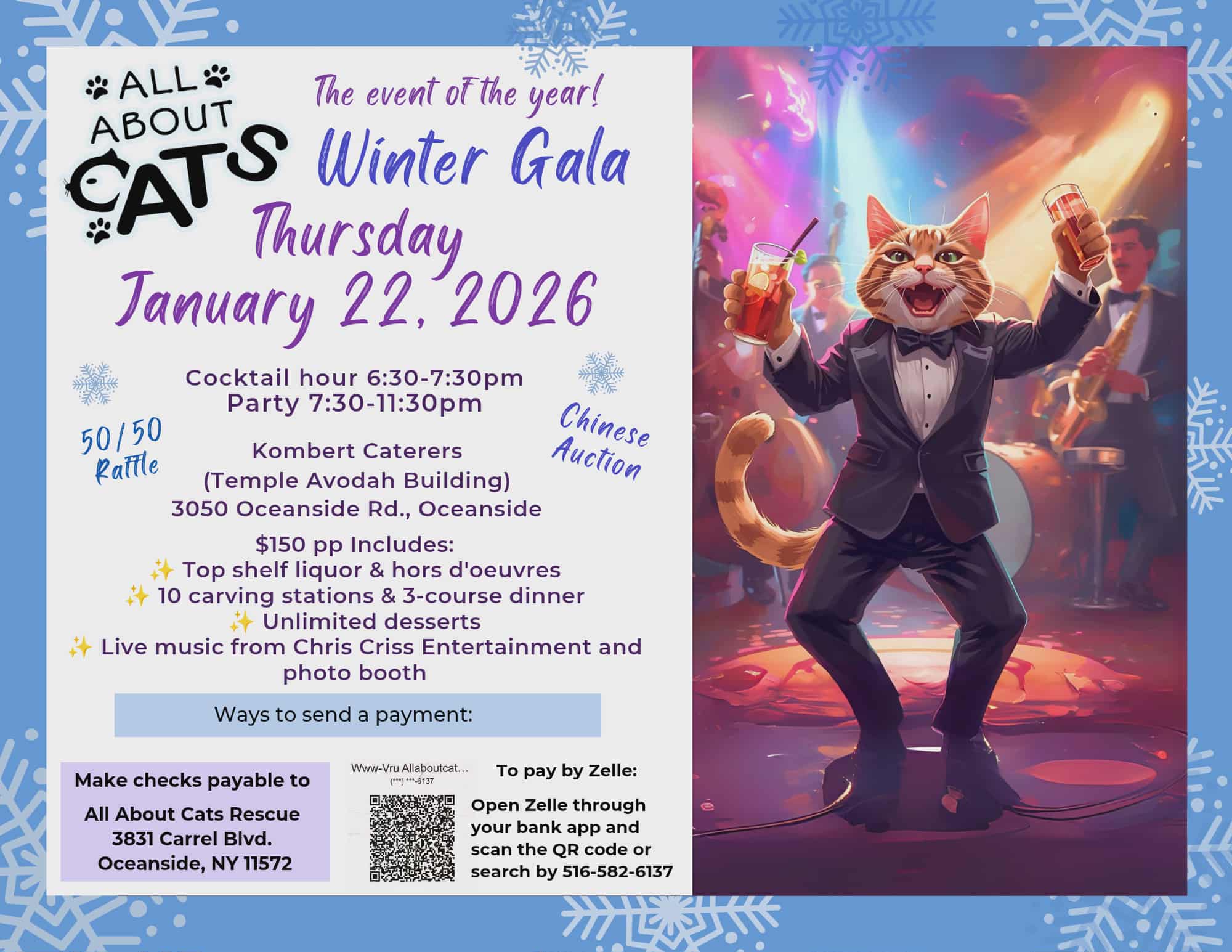 All About Cats Rescue is a recognized 501(c)(3) not-for-profit organization. All donations are tax deductible and the kitties will love you for it. You can make a secure donation online or mail a check if you prefer to All About Cats Rescue, 111 East Sunrise Highway, Freeport, New York, 11520.